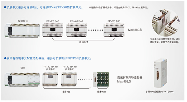 I/O點數最大452點 (通過擴展FP0以及使用功能擴充插件可達到。)