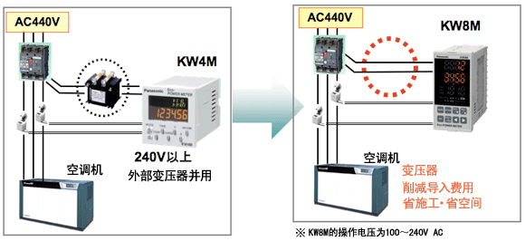 如圖(A)以往商品1次邊測定400A時,專用CT和已設的CT形成兩段構成使用。AKW8115 一次側4000A以下情況未形成兩段構成時,可直接連接。