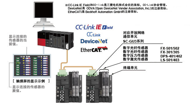 通過(guò)對(duì)應(yīng)開放網(wǎng)絡(luò)的通信單元SC-GU3系列を可以連接至開放網(wǎng)絡(luò)CC-Link IE Field/CC-Link/DeviceNet/EtherCAT。PLC、電腦等監(jiān)控儀器都可以進(jìn)行連接設(shè)置。