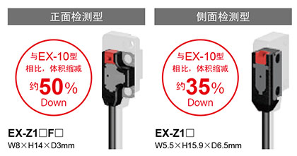 ※與EX-10系列相比 采用無引線焊接貼裝的新型半導體封裝技術,實現超薄※3mm機殼。即便是過去只有光纖頭才能安裝的狹窄空間,而今也可輕松自如地裝入。同時,內置有放大器,無需另外安裝放大器,可節省空間。 ※截止2017年6月,據本公司對內置放大器的光電傳感器展開的調查。